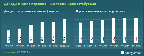 Примечательно, что спрос на услуги такси в РК в этом году увеличивается, в то время как объем перевозок пассажиров автобусами показывает хоть и небольшое, но сокращение — за январь-октябрь было перевезено на 0,7%, или на 99,8 млн человек меньше, чем год назад.