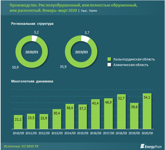Наибольший объём риса традиционно произвели в Кызылординской области: 94,1% от РК, или 50,9 тыс. тонн — плюс 41,9% за год. Ещё 3,2 тыс. тонн, или 5,9% от РК, пришлось на Алматинскую область. Впрочем, здесь выпуск сократился на 14,3% к прошлому году.