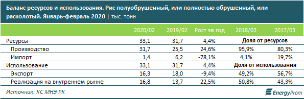 В целом казахстанские производители риса практически полностью перекрывают спрос в секторе: по итогам первых двух месяцев уровень самообеспечения составил 95,9%.