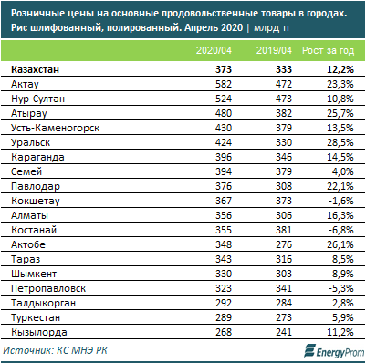 В апреле килограмм риса на розничном рынке РК стоил в среднем 373,3 тенге — на 12,2% больше, чем годом ранее. При этом в сравнении с мартом текущего года стоимость риса даже сократилась — на 0,1%.