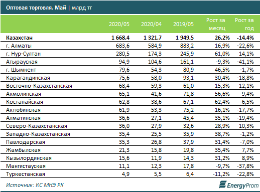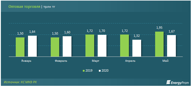 В мае 2020 года оптовики наторговали товаров на 1,7 трлн тг — на 26,2% больше, чем в «карантинном» апреле текущего года, однако на 14,4% меньше, чем в мае 2019-го. Из общего объёма оптовой торговли 19,6%, или 302,4 млрд тг, пришлось на продовольственные товары, ещё 80,4%, или 1,4 трлн тг — на непродовольственные товары и товары производственно-технического назначения.