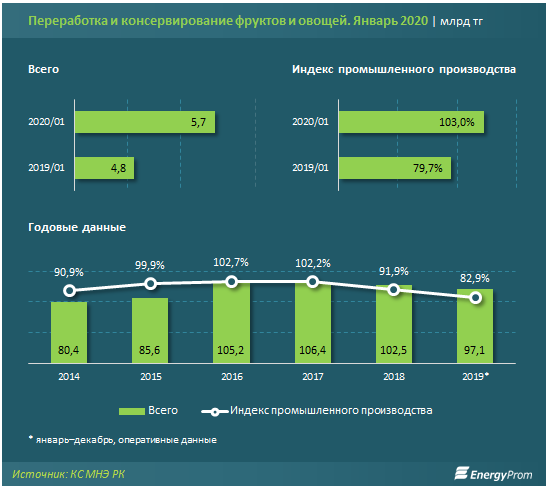 За январь 2020 года казахстанские компании переработали и законсервировали фруктов и овощей на сумму 5,7 млрд тг — на 3% больше (с учётом инфляции), чем в январе прошлого года (4,8 млрд тг).