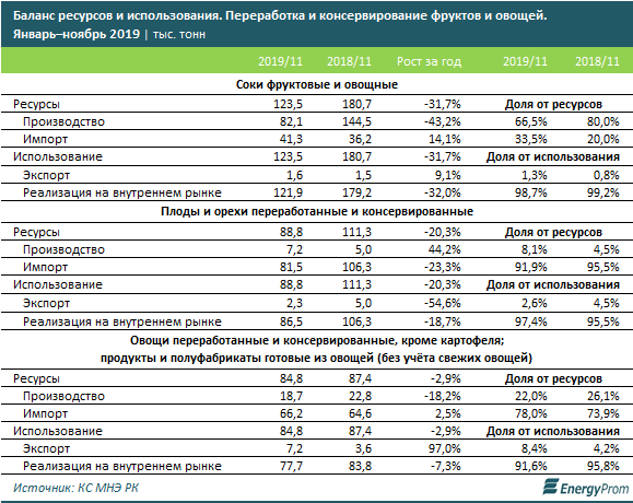 Казахстанские компании не смогли полностью обеспечить спрос (экспорт плюс реализация на внутреннем рынке) на переработанные и консервированные овощи и фрукты. Так, по итогам 11 месяцев прошлого года спрос в сегменте овощных и фруктовых соков перекрыт лишь на 66,5% — и это не самый пессимистичный показатель.
