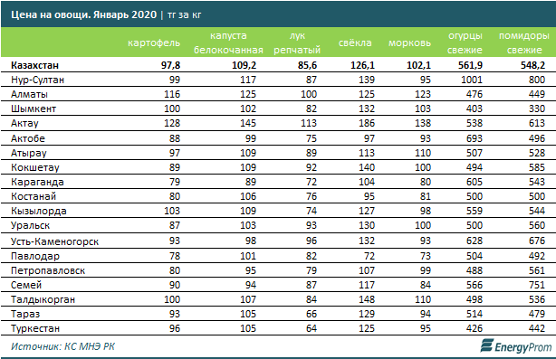 Основные овощи — картофель, капуста, лук, свёкла и морковь — дороже всего обходятся жителям Актау, а свежие огурцы и помидоры — жителям столицы