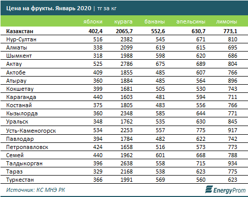 Самые дорогие яблоки и апельсины — в Усть-Каменогорске, курага и бананы — в Актау, а лимоны — в Талдыкоргане.