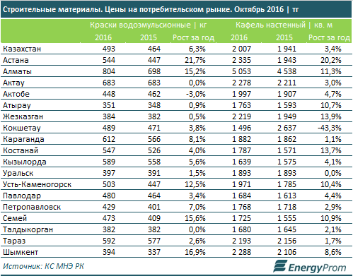 Отделочные материалы для стен и потолка заметнее всего подорожали в столице (+20% за год — кафель, +22% — краски), сухие строительные смеси — в Усть-Каменогорске (+17%), цемент — в Уральске (+18%)