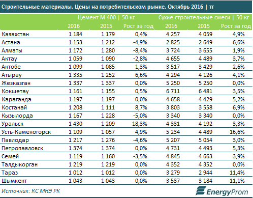 Цемент марки прочности М 400 стоил в октябре в среднем 1 184 тг за 50 кг — плюс 0,4%. Самая высокая цена наблюдалась в Уральске — 1430 тг, и здесь же — самый значительный рост цены — плюс 18,3% за год. Дешевле всего цемент стоил в Таразе — 1 012 тг за 50 кг.