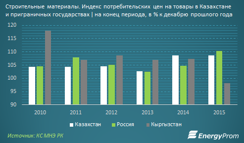 По итогам 2015 самое значительное удорожание строительных материалов год-к-году среди соседей по ЕАЭС отмечено в России, где ИПЦ достиг 110,4%. По РК индекс составил 108,7%, по Кыргызстану отмечено снижение цен, ИПЦ — 98,2%.