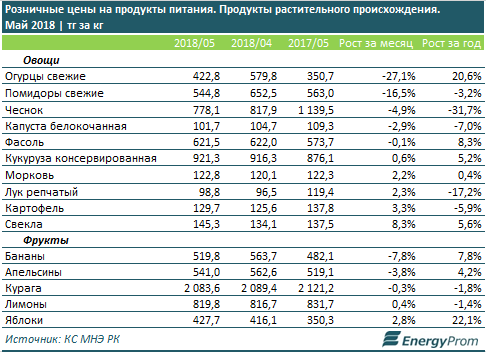 За май заметно подешевели сезонные овощи: огурцы — на 27,1% к апрелю, помидоры — на 16,5%, чеснок — на 4,9%, капуста — на 2,9%.