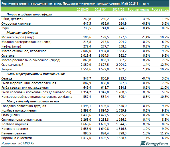 Среди товаров животного происхождения за май снизились в цене продукты птицефабрик: яйца упали в цене на 3,8% за месяц, куриные окорочка — почти на 1%.