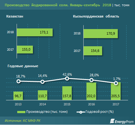 В целом производство йодированной соли стабильно нарастает. Наибольшее увеличение выпуска в последние годы наблюдалось в 2015-м (+42,6%, до 157,8 тыс. тонн). К 2017-му темпы годового роста сократились до 1,7%, а производство по итогам года составило соответственно 205,5 тыс. тонн.