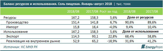 Соль в РК импортируют мало: местное производство по итогам января–августа 2018 года обеспечило более 90% спроса.