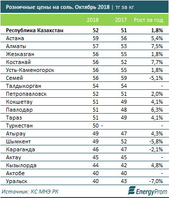 Высокий уровень самообеспечения отечественной продукцией позволяет рынку удерживать цены на соль практически без изменений. Так, в октябре 2018 года соль подорожала всего на 1,8% в сравнении с октябрем 2017 года — до 52 тенге за кг.