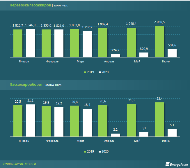 В июне текущего года пассажироперевозки автомобильным и городским электрическим транспортом достигли 534,6 млн чел. — в 1,7 раза больше, чем в предыдущем мае, и в 2,4 раза больше, чем в «карантинном» апреле. В то же время показатель всё ещё сильно уступает июню прошлого года — сразу в 3,8 раза.
