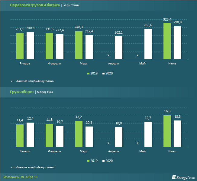 Перевозки груза и багажа автомобильным и городским транспортом в июне составили 290,8 млн тонн — на 9,5% больше, чем в мае текущего года, и сразу на 43,9% больше, чем в апреле, но в то же время на 10,1% меньше, чем в июне 2019-го.