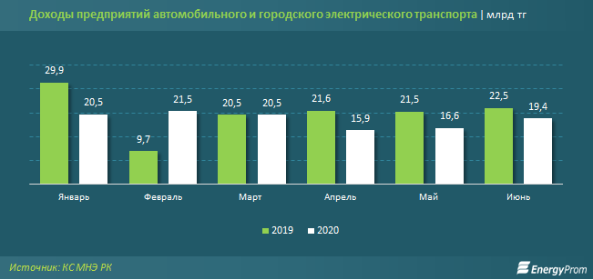 Доходы предприятий автомобильного и городского электрического транспорта в июне достигли 19,4 млрд тг — на 16,8% больше, чем в мае текущего года, но на 14% меньше, чем годом ранее.