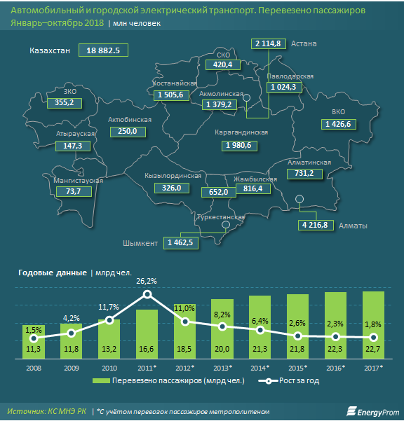 Лидером в перевозке пассажиров, естественно, является Алматы — 4,2 млрд человек (+1,3% за год). На втором месте Астана (+2,3% за год, до 2,1 млрд человек), на третьем — Караганда (+2,8% за год, почти 2 млрд человек).