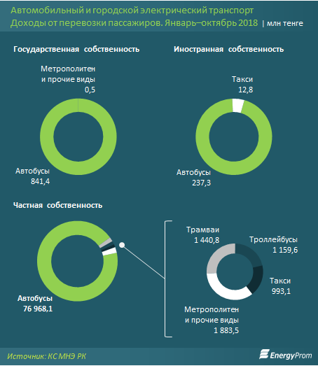 В государственном секторе доходы от перевозок пассажиров составили почти 842 млн тенге, однако здесь основная доля пришлась на метрополитен — до 841,4 млн тенге, а автобусные перевозки составили лишь 0,5 млн тенге.