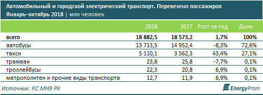За 10 месяцев 2018 года перевозки пассажиров на автомобильном и городском электрическом транспорте составили 18,9 млрд человек, что на 1,7% больше, чем в аналогичном периоде годом ранее.