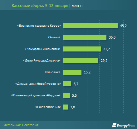 По итогам прошедшего уикенда (9–12 января), как и в первые после Нового года выходные, лидером кинопроката стал комедийный казахстанский фильм Алена Ниязбекова «Бизнес по-казахски в Корее».
