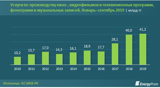 Впрочем, услуги по производству кино-, видеофильмов и телепрограмм за три квартала прошлого года составили всего 41,2 млрд тг, против 40 млрд тг годом ранее.