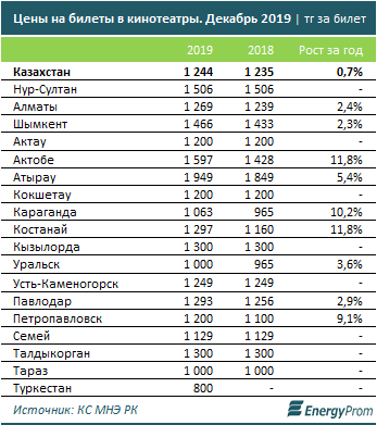 Цены на билеты в кино к январю в среднем по городам РК составили 1244 тг — всего на 0,7% больше, чем годом ранее.