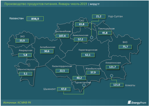 В стоимостном выражении больше всего продуктов питания произвели в Алматинской области: 121,7 млрд тг (годом ранее — 116,8 млрд тг). Также среди лидеров Алматы и Костанайская область, где производство составило 121 млрд и 107,4 млрд тг соответственно. В ведущую пятёрку регионов вошли Восточно-Казахстанская (75,7 млрд тг) и Северо-Казахстанская (65,8 млрд тг) области.