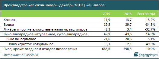 В то же время выпуск более лёгких напитков — вина и пива, — напротив, заметно увеличился: пива — на 10,9%, до 663,6 млн литров; вина (включая сусло) — на 14,3%, до 49,9 млн литров (непосредственно виноградное вино составило 21,6 млн литров, из них игристое вино — 3,1 млн литров).