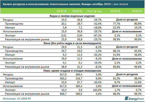 Рынок водки и ликёро-водочных изделий обеспечивается отечественным производством в целом неплохо: по итогам 10 месяцев казахстанские компании перекрыли сразу 77,7% спроса.