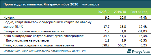 За январь–октябрь 2020 года в стране произвели 598,2 млн литров пива — на 6,2% больше, чем годом ранее. Также компании нарастили производство водки: на 12,4% за год, до 17,7 млн литров.