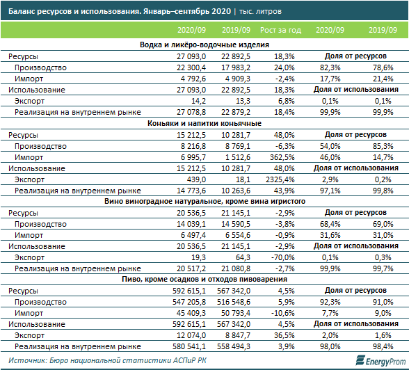 Основной объём производства пива и коньяка в региональном разрезе пришлось на Алматы и Алматинскую область, виноградного вина — на Алматинскую и Жамбылскую области, водки — на Акмолинскую и Северо-Казахстанскую области.