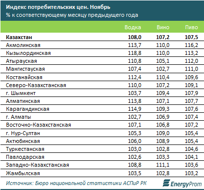 Удорожание пива, вина и водки зафиксировано во всех регионах страны. Сильнее всего рост цен на водку ощутили жители Кызылординской области, на вино — жители Западно-Казахстанской области, на пиво — жители Акмолинской области.