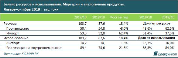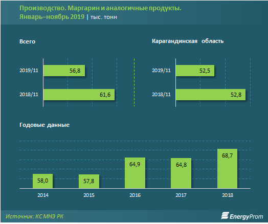 Производство маргарина и аналогичных жировых продуктов за неполный 2019 год составило всего 56,8 тыс. тонн, против 61,6 тонн за январь–ноябрь прошлого года (минус 7,9%).