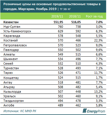 Дороже всего среди крупных городов и мегаполисов страны маргарин обходится жителям Нур-Султана (760 тг за кг, +3% за год), Усть-Каменогорска (629 тг за кг, +6,3%) и Караганды (578 тг за кг, +5,5%).