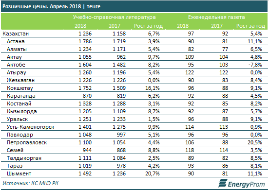 Учебно-справочная литература подорожала сильнее — на 6,7% год-к-году, до 1236 тг в среднем по стране.