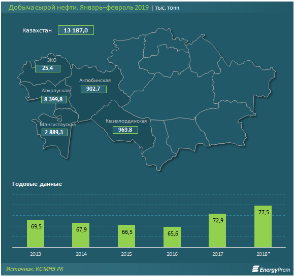 Добыча сырой нефти по итогам первых двух месяцев 2019-го составила 13,2 млн тонн — на 5,8% больше, чем в аналогичном периоде прошлого года. Почти 64% добычи пришлось на Атыраускую область (8,4 млн тонн, +11% за год). Напомним, в регионе крупными добытчиками в секторе являются филиал «Норт Каспиан Оперейтинг Компани Н.В.» (месторождение Кашаган), ТОО «Тенгизшевройл» (месторождение Тенгиз), АО «Эмбамунайгаз» и др. Ещё 21,9% приходится на Мангистаускую область (2,9 млн тонн, −1,5% за год) и 7,4% — на Кызылординскую область (969,8 тыс. тонн, −7% за год).
