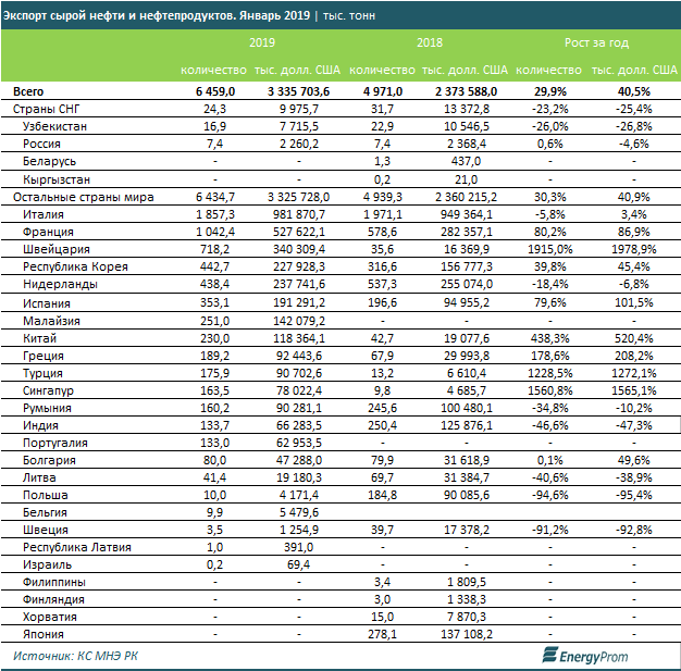 Усилено экспортное направление: экспорт нефти за первый месяц текущего года достиг 6,5 млн тонн и 3,3 млрд долл. США (+29,9% в натуральном выражении, +40,5% — в денежном). Основной импортёр казахстанской нефти — Италия (1,9 млн тонн за январь 2019-го, −5,8% за год). В деньгах поставки в эту страну составили 981,9 млн долл. США — на 3,4% больше, чем годом ранее.