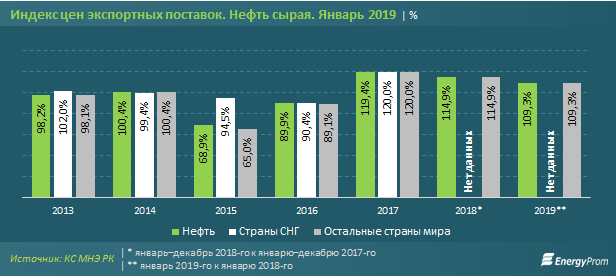 По итогам первого месяца текущего года экспортные цены на казахстанскую нефть увеличились на 9,3% к аналогичному периоду годом ранее.