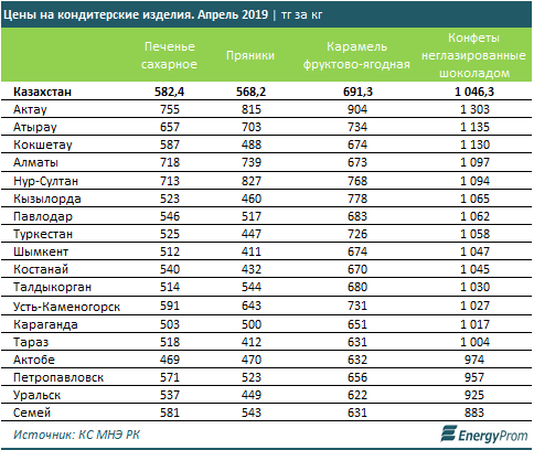 Цены на пряники выросли на 1,2% за месяц и на 7,2% — за год, до 568,2 тг за кг. Дороже всего пряники обходятся жителям столицы (827 тг за кг), Актау (815 тг за кг) и Алматы (739 тг за кг) — той же тройки самых «дорогих» городов для казахстанских любителей сладкого.