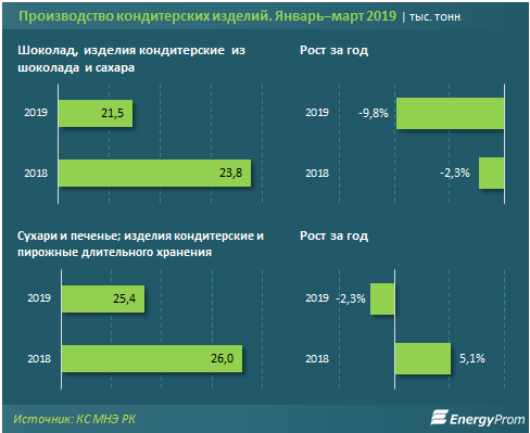 За I квартал казахстанские кондитеры произвели 21,5 тыс. тонн кондитерских изделий из шоколада — на 9,8% меньше, чем годом ранее. Производство мучных кондитерских изделий длительного хранения также сократилось: на 2,3% за год, до 25,4 тыс. тонн.
