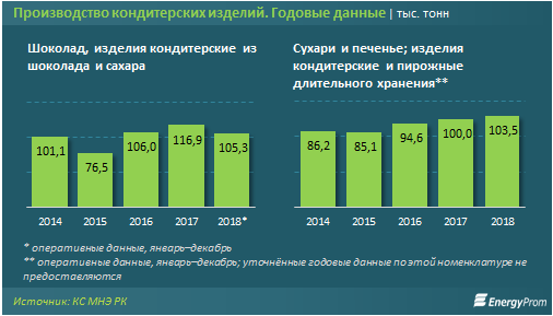Казахстанцев обеспечивают сладостями такие крупные производители, как АО «Рахат», принадлежащее ведущей южнокорейской кондитерской компании LOTTE Confectionery (производственные мощности расположены на двух площадках: в Алматы и Шымкенте), АО «Баян-Сулу» (Костанайская область), «Хамле Компани ЛТД», входящая в состав турецкой lker Group (Алматинская область) и т. д.