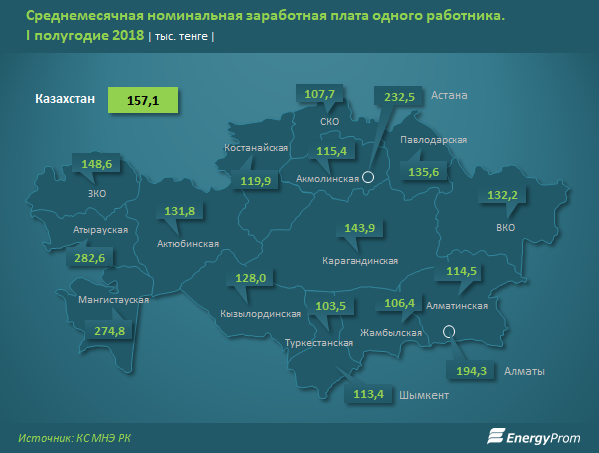 По итогам I полугодия средняя номинальная заработная плата казахстанцев составляла 157,1 тыс. тг — это на 8,3% больше, чем в аналогичном периоде годом ранее.
