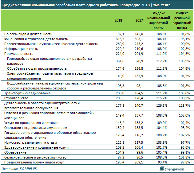 Также высокие зарплаты — у работников финансово-страховой сферы (316,5 тыс. тг, на 4,4% больше, чем годом ранее), профессиональной, научной и технической отрасли (260,9 тыс. тг, на 6,4% больше, чем год назад) и информации и связи (229,2 тыс. тг, +8,9%).