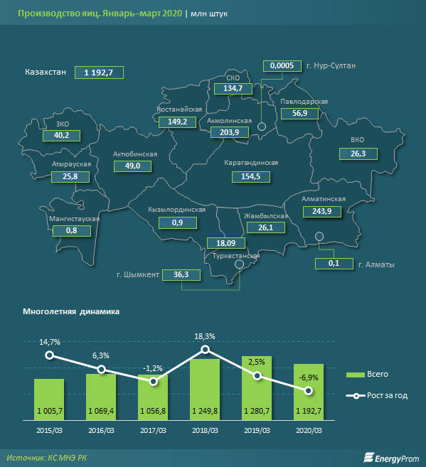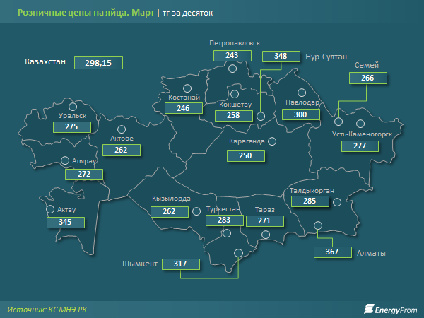 В марте 2020 года в магазинах и на базарах страны средняя цена десятка яиц достигла 298,15 тг. Годовое удорожание составило сразу заметные 10,7%.