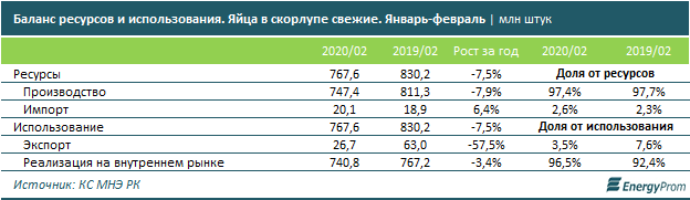 За январь-февраль 2020 года казахстанские компании обеспечили спрос (экспорт плюс реализация на внутреннем рынке) на яйца в скорлупе на 97,4%. В то же время экспорт яиц казахстанскими компаниями сократился за год на критические 57,5%.