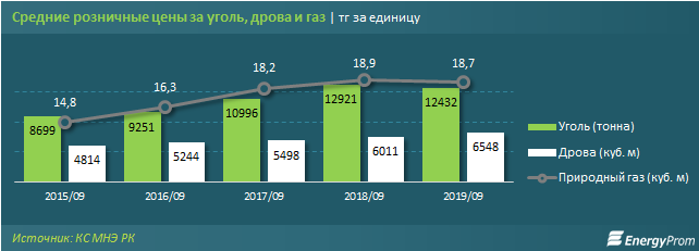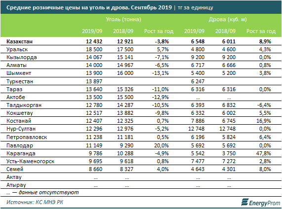 По данным Комитета по статистике МНЭ РК, самые высокие цены на уголь зафиксированы в Уральске (18,5 тыс. тг за тонну), Кызылорде (14,1 тыс. тг) и Алматы (14 тыс. тг). Самые высокие цены на дрова — в Нур-Султане: 12,7 тыс. тг за 1 куб. м; стоимость угля в столице — 12,3 тыс. тг за тонну.