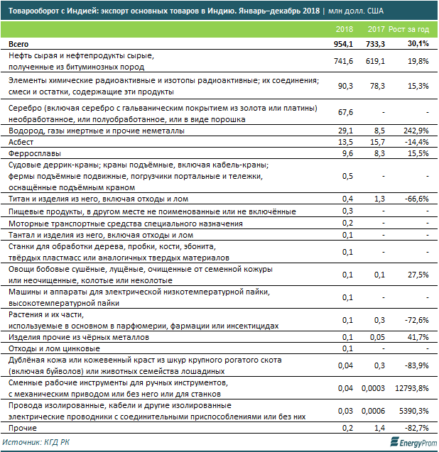 За прошлый год экспорт из Казахстана в Индию увеличился на 30,1% и составил 954,1 млн долл. США.