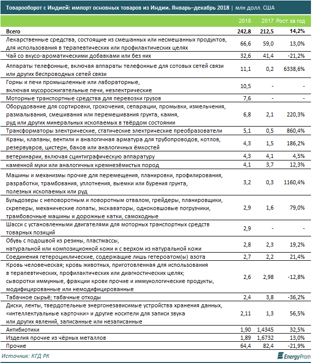 Импорт из Индии по итогам прошлого года увеличился на 14,2% и составил 242,8 млн долл. США.