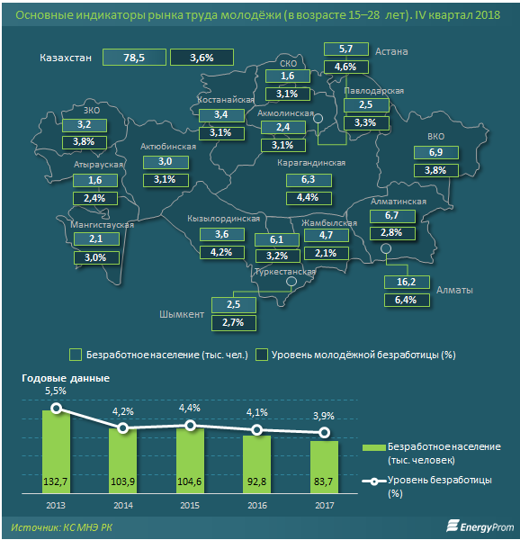 За IV квартал 2018 года безработное население среди молодёжи в возрасте 15–28 лет сократилось на 8,7% в сравнении с аналогичным периодом 2017 года, до 78,5 тыс. человек. Больше всего безработного населения среди молодёжи в Алматы — 16,2 тыс. человек (+3,2% за год), ВКО — 6,9 тыс. человек (17,9% за год) и Алматинской области — 6,7 тыс. человек (14,8% за год).