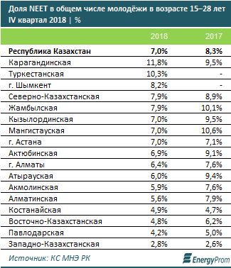 Доля NEET («Not in Employment, Education or Training») в общем числе молодёжи за IV квартал прошлого года составила 7% (годом ранее — 8,3%). Самый высокий показатель среди молодёжи, не занятой в сфере труда, образования или обучения — в Карагандинской области: 11,8% (против 9,5% годом ранее), в Туркестанской области (10,3%) и в Шымкенте (8,2%).